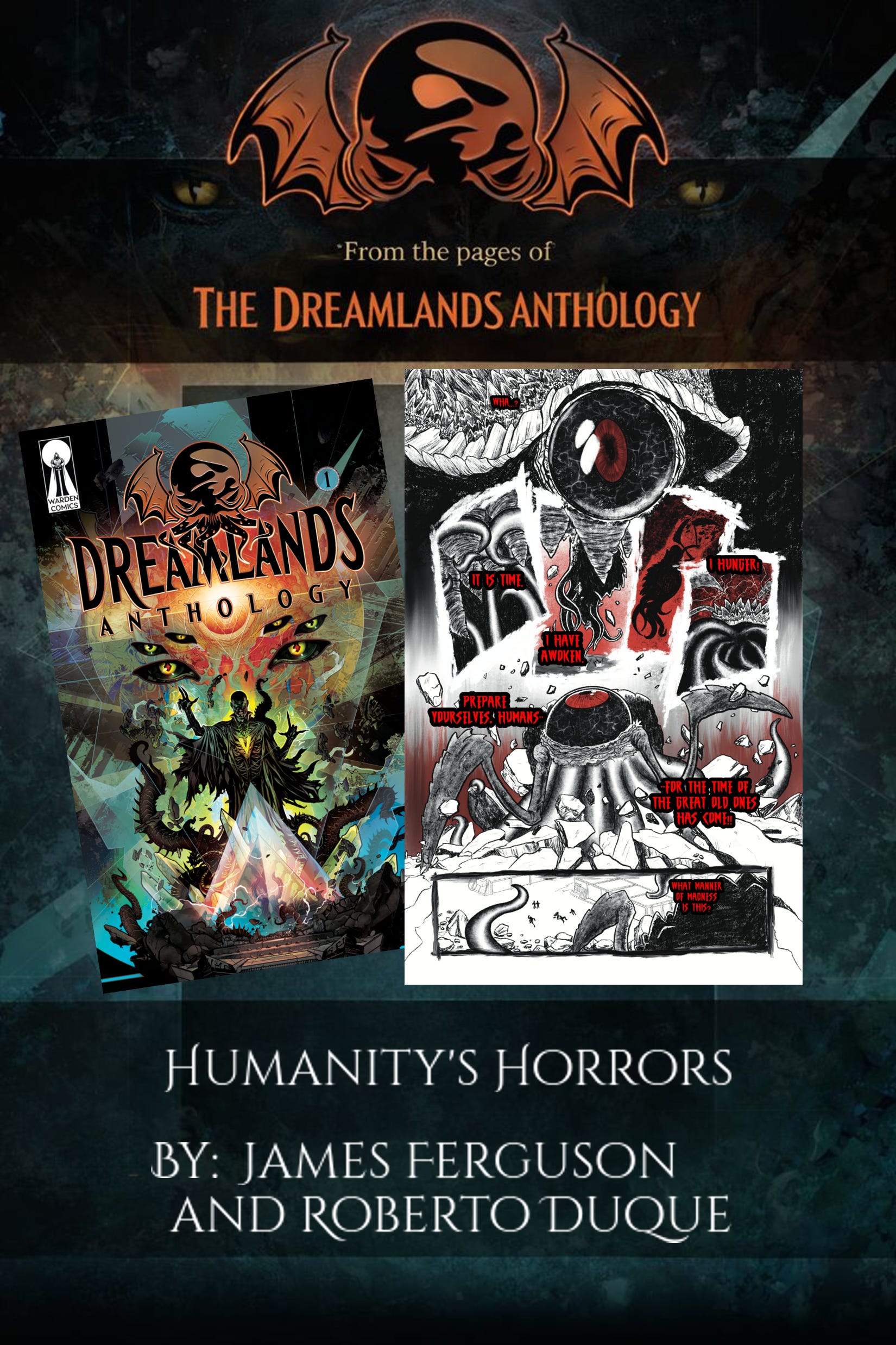 While I have you in the Kickstarter mood, the campaign for The Dreamlands Anthology has officially launched. Please check out the campaign for a collection of TWENTY horror stories inspired by the works of H.P. Lovecraft including “Humanity’s Horrors” from myself and Roberto Duque. This story is killer, following Rhan-Tegoth, an Elder God that awakens to the present day, only to be horrified by what he finds.